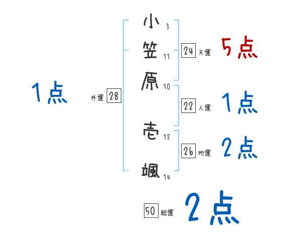 外運![]() | 小笠原壱颯さんの外運は28画の1つ星!家庭環境に注意。スポーツで活躍できる能力があるかも。 生活面を象徴する運勢です。外部から受ける影響力を表し、結婚運、家庭運や職場、環境への順応性を表します。 |