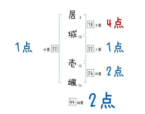 総運![]() | 居城壱颯さんの総運は44画の2つ星!誠実で慎重な性格。物事を考えすぎないように注意しましょう。 あなたの人生を表す1番重要な運勢です。生涯を通じて影響する総合運となり、主に50歳以降の晩年期に影響を及ぼします。 |