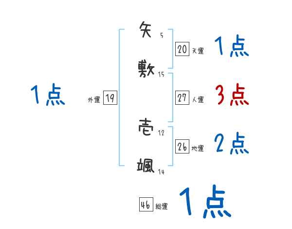 外運![]() | 矢敷壱颯さんの外運は19画の1つ星!優れた才能を持ちますが、協調性が足りないことも。周りの人と協力する事を意識しましょう。 生活面を象徴する運勢です。外部から受ける影響力を表し、結婚運、家庭運や職場、環境への順応性を表します。 |