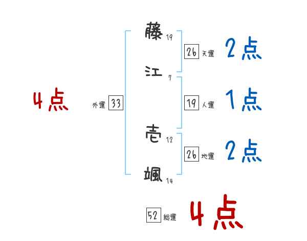 外運![]() | 藤江壱颯さんの外運は33画の4つ星!権力志向でプライドが高い。勇気があり運を切り開き成功する。 生活面を象徴する運勢です。外部から受ける影響力を表し、結婚運、家庭運や職場、環境への順応性を表します。 |