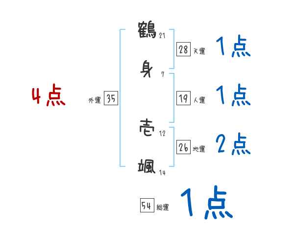 天運![]() | 鶴身壱颯さんの天運は28画の1つ星!家庭環境に注意。スポーツで活躍できる能力があるかも。 家系が持つ宿命的な運勢を表します。祖先から受け継いだ苗字ですので自分の力が及びません。家柄を象徴します。 |