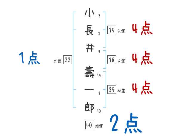 外運![]() | 小長井壽一郎さんの外運は22画の1つ星!努力することが苦手ないっぽう手先が器用。芸術性にも優れる。 生活面を象徴する運勢です。外部から受ける影響力を表し、結婚運、家庭運や職場、環境への順応性を表します。 |