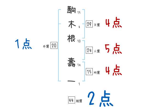 総運![]() | 駒木根壽一さんの総運は44画の2つ星!誠実で慎重な性格。物事を考えすぎないように注意しましょう。 あなたの人生を表す1番重要な運勢です。生涯を通じて影響する総合運となり、主に50歳以降の晩年期に影響を及ぼします。 |