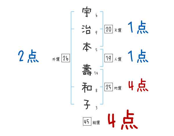 外運![]() | 宇治本壽和子さんの外運は26画の2つ星!波瀾万丈かも。信頼できる人を大事にしましょう。 生活面を象徴する運勢です。外部から受ける影響力を表し、結婚運、家庭運や職場、環境への順応性を表します。 |