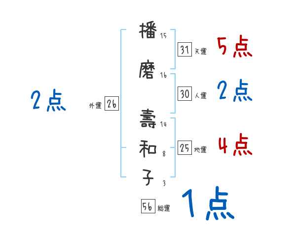天運![]() | 播磨壽和子さんの天運は31画の5つ星!社交性があり判断力に優れる。順風満帆な人生で円満な生活。 家系が持つ宿命的な運勢を表します。祖先から受け継いだ苗字ですので自分の力が及びません。家柄を象徴します。 |
