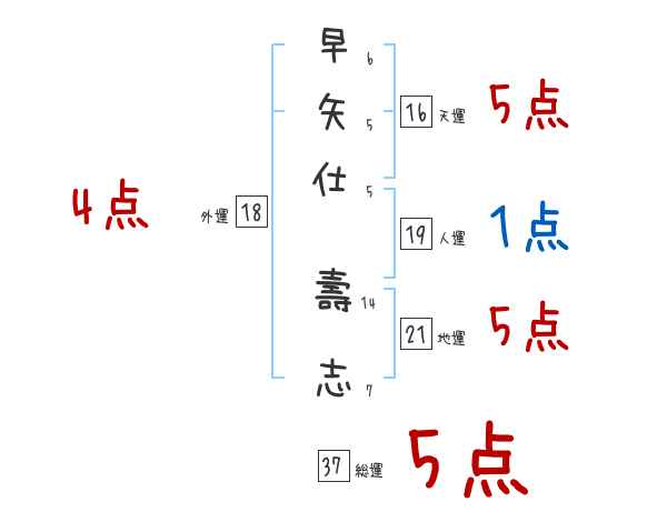 天運![]() | 早矢仕壽志さんの天運は16画の5つ星!人望が厚く大きく発展する。逆転成功が見える。 家系が持つ宿命的な運勢を表します。祖先から受け継いだ苗字ですので自分の力が及びません。家柄を象徴します。 |