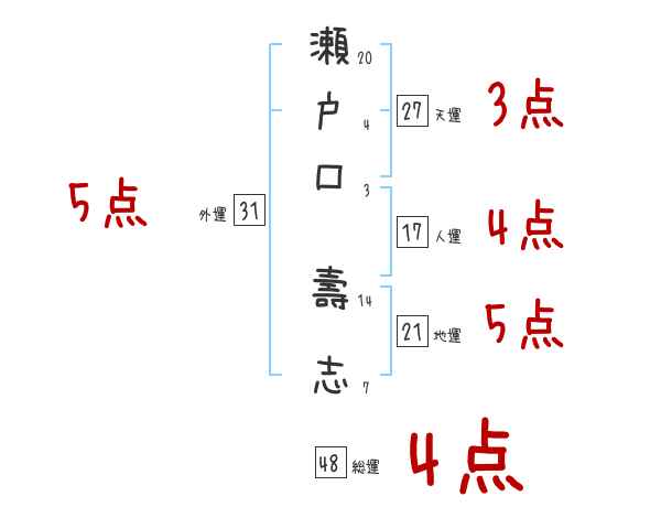 天運![]() | 瀬戸口壽志さんの天運は27画の3つ星!頭脳明晰だが強情で摩擦が多い傾向。孤立に注意。 家系が持つ宿命的な運勢を表します。祖先から受け継いだ苗字ですので自分の力が及びません。家柄を象徴します。 |