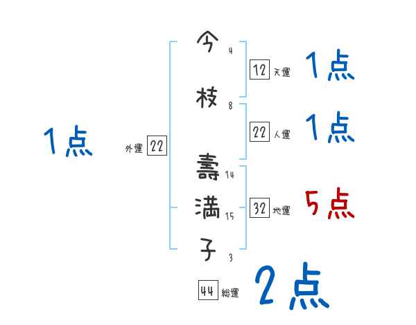 天運![]() | 今枝壽満子さんの天運は12画の1つ星!簡単な失敗で諦めてしまいやすいかも。着実に行動すると良いでしょう。 家系が持つ宿命的な運勢を表します。祖先から受け継いだ苗字ですので自分の力が及びません。家柄を象徴します。 |