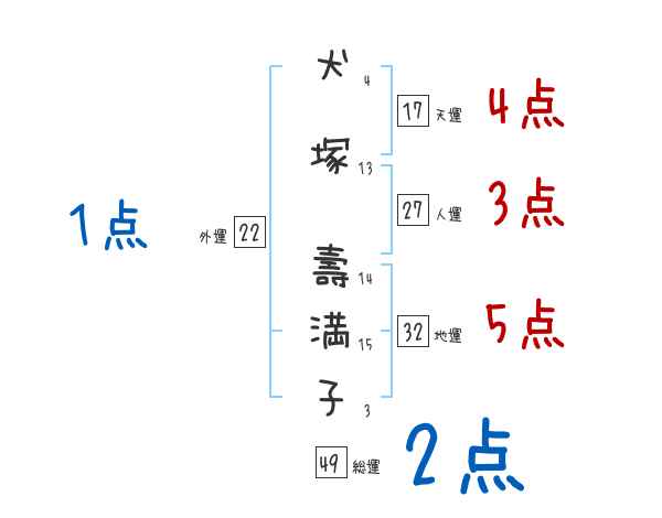 外運![]() | 犬塚壽満子さんの外運は22画の1つ星!努力することが苦手ないっぽう手先が器用。芸術性にも優れる。 生活面を象徴する運勢です。外部から受ける影響力を表し、結婚運、家庭運や職場、環境への順応性を表します。 |