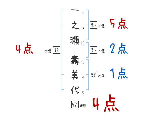 外運![]() | 一之瀬壽美代さんの外運は18画の4つ星!情熱的で剛気。忍耐力があり信頼される。 生活面を象徴する運勢です。外部から受ける影響力を表し、結婚運、家庭運や職場、環境への順応性を表します。 |