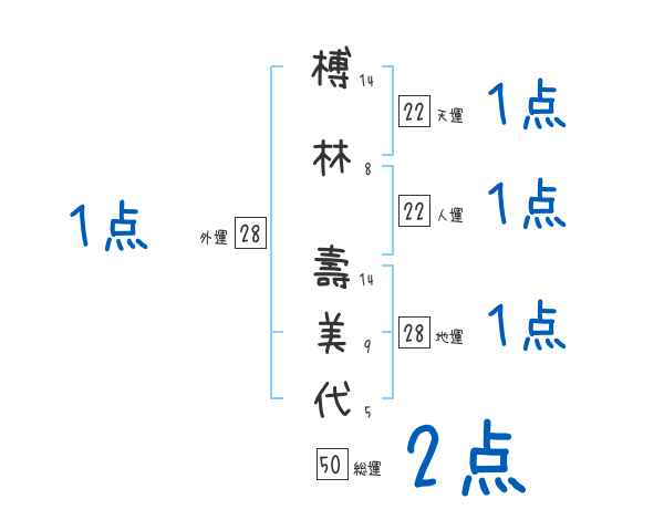人運![]() | 榑林壽美代さんの人運は22画の1つ星!努力することが苦手ないっぽう手先が器用。芸術性にも優れる。 性格や才能などを表す2番目に重要な運勢です。人間関係や協調性、社会的な成功に影響します。主に20歳から50歳ぐらいまでの中年期の運勢を表します。 |