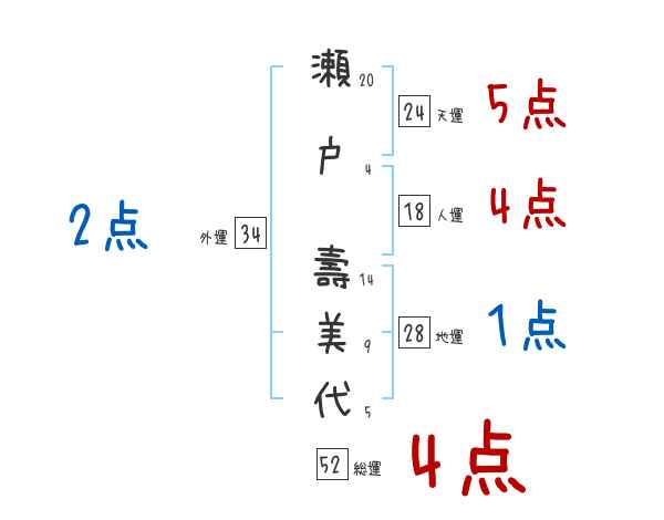 総運![]() | 瀬戸壽美代さんの総運は52画の4つ星!先見性と独創性に優れ考える力がある。強運の持ち主。 あなたの人生を表す1番重要な運勢です。生涯を通じて影響する総合運となり、主に50歳以降の晩年期に影響を及ぼします。 |