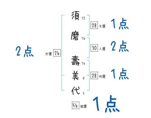 外運![]() | 須磨壽美代さんの外運は26画の2つ星!波瀾万丈かも。信頼できる人を大事にしましょう。 生活面を象徴する運勢です。外部から受ける影響力を表し、結婚運、家庭運や職場、環境への順応性を表します。 |