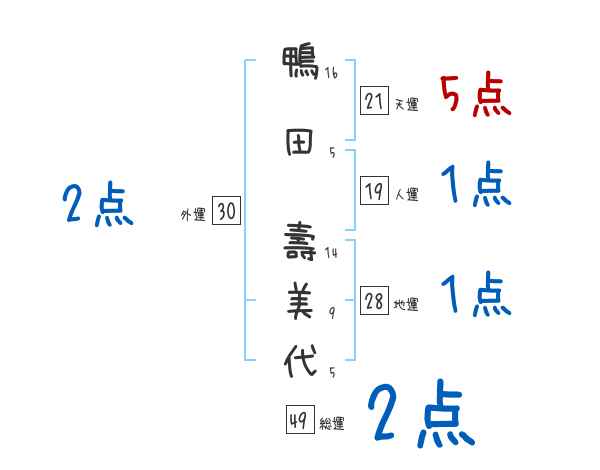 天運![]() | 鴨田壽美代さんの天運は21画の5つ星!統率力がある。独立し成功する。名誉を手に入れる。 家系が持つ宿命的な運勢を表します。祖先から受け継いだ苗字ですので自分の力が及びません。家柄を象徴します。 |