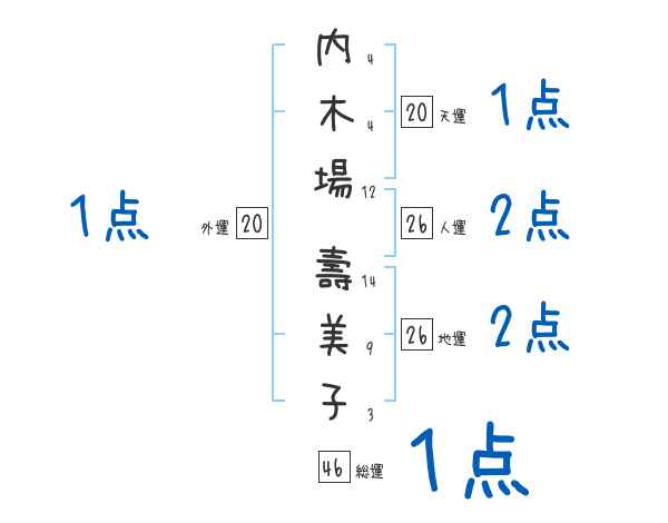 総運![]() | 内木場壽美子さんの総運は46画の1つ星!迷走することが多く苦労するかも。目先のことにとらわれないように。 あなたの人生を表す1番重要な運勢です。生涯を通じて影響する総合運となり、主に50歳以降の晩年期に影響を及ぼします。 |