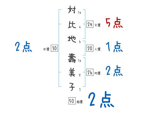 外運![]() | 対比地壽美子さんの外運は30画の2つ星!浮き沈みの激しさに注意しましょう。 生活面を象徴する運勢です。外部から受ける影響力を表し、結婚運、家庭運や職場、環境への順応性を表します。 |