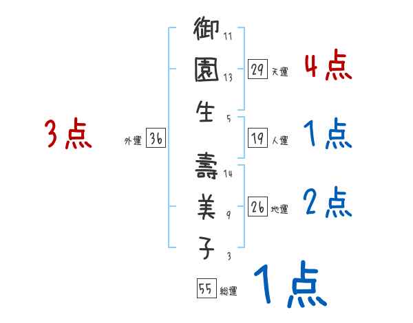 外運![]() | 御園生壽美子さんの外運は36画の3つ星!先見性が豊かです。多少神経質で苦労することも。 生活面を象徴する運勢です。外部から受ける影響力を表し、結婚運、家庭運や職場、環境への順応性を表します。 |