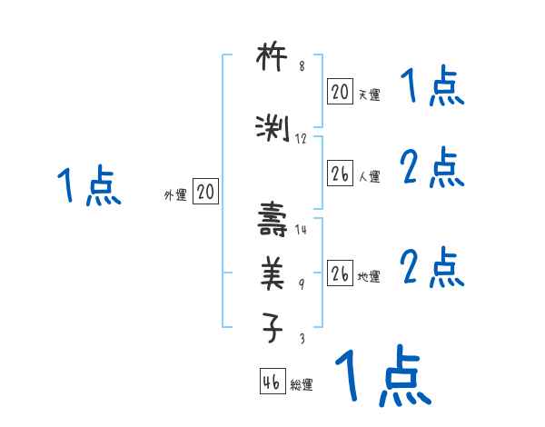 総運![]() | 杵渕壽美子さんの総運は46画の1つ星!迷走することが多く苦労するかも。目先のことにとらわれないように。 あなたの人生を表す1番重要な運勢です。生涯を通じて影響する総合運となり、主に50歳以降の晩年期に影響を及ぼします。 |