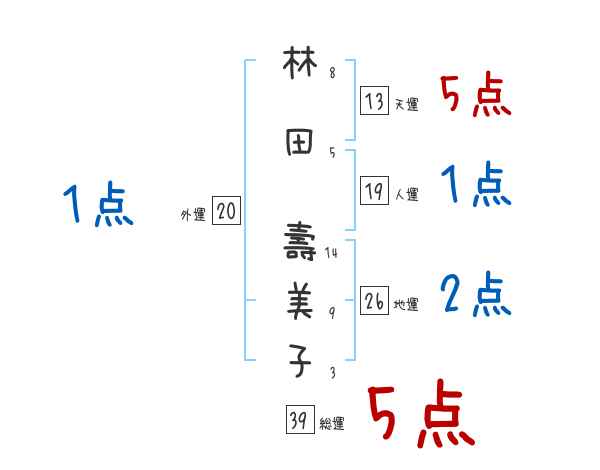 総運![]() | 林田壽美子さんの総運は39画の5つ星!社交性に優れ人望が厚い。人の上に立ち成功する。 あなたの人生を表す1番重要な運勢です。生涯を通じて影響する総合運となり、主に50歳以降の晩年期に影響を及ぼします。 |