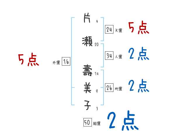 総運![]() | 片瀬壽美子さんの総運は50画の2つ星!浮き沈みが激しく不安定。しりすぼみに衰退しやすいので注意しましょう。 あなたの人生を表す1番重要な運勢です。生涯を通じて影響する総合運となり、主に50歳以降の晩年期に影響を及ぼします。 |