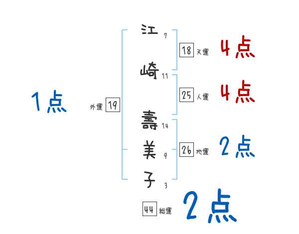 天運![]() | 江崎壽美子さんの天運は18画の4つ星!情熱的で剛気。忍耐力があり信頼される。 家系が持つ宿命的な運勢を表します。祖先から受け継いだ苗字ですので自分の力が及びません。家柄を象徴します。 |