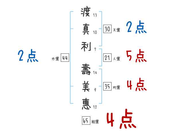 外運![]() | 渡真利壽美惠さんの外運は44画の2つ星!誠実で慎重な性格。物事を考えすぎないように注意しましょう。 生活面を象徴する運勢です。外部から受ける影響力を表し、結婚運、家庭運や職場、環境への順応性を表します。 |