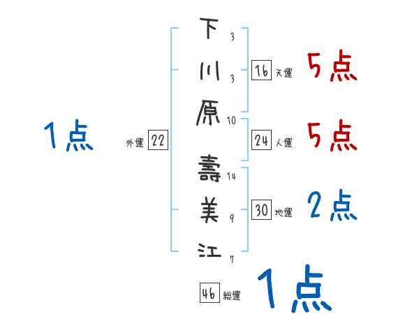 総運![]() | 下川原壽美江さんの総運は46画の1つ星!迷走することが多く苦労するかも。目先のことにとらわれないように。 あなたの人生を表す1番重要な運勢です。生涯を通じて影響する総合運となり、主に50歳以降の晩年期に影響を及ぼします。 |