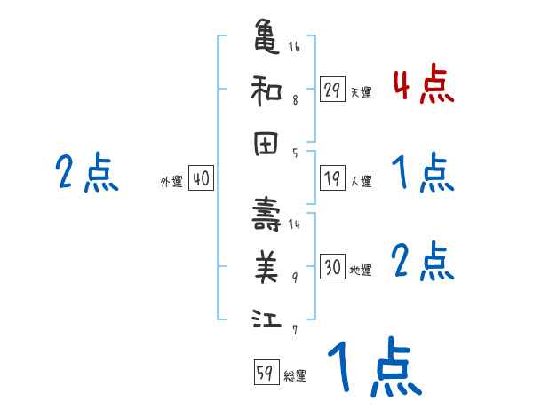 天運![]() | 亀和田壽美江さんの天運は29画の4つ星!完全主義で才能がある。厳格な心の持ち主。 家系が持つ宿命的な運勢を表します。祖先から受け継いだ苗字ですので自分の力が及びません。家柄を象徴します。 |