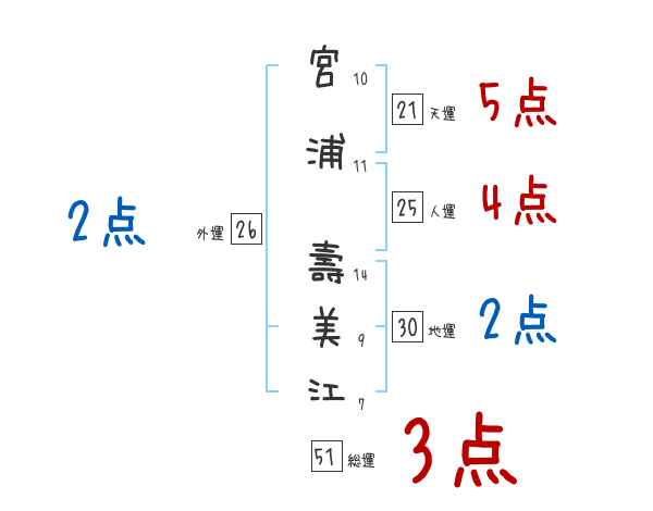 天運![]() | 宮浦壽美江さんの天運は21画の5つ星!統率力がある。独立し成功する。名誉を手に入れる。 家系が持つ宿命的な運勢を表します。祖先から受け継いだ苗字ですので自分の力が及びません。家柄を象徴します。 |