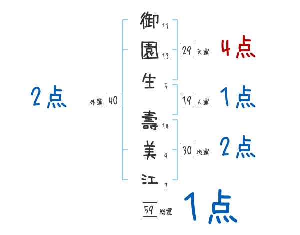 総運![]() | 御園生壽美江さんの総運は59画の1つ星!意志の弱さであきらめることが多いかも。粘り強さが必要。 あなたの人生を表す1番重要な運勢です。生涯を通じて影響する総合運となり、主に50歳以降の晩年期に影響を及ぼします。 |