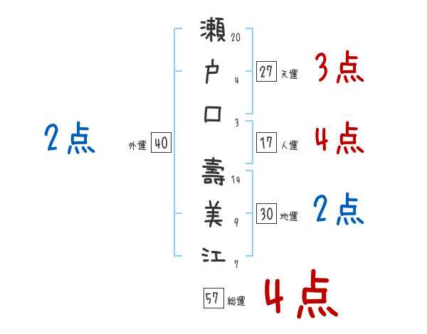 総運![]() | 瀬戸口壽美江さんの総運は57画の4つ星!向上心があり人望がある。地位を得る。 あなたの人生を表す1番重要な運勢です。生涯を通じて影響する総合運となり、主に50歳以降の晩年期に影響を及ぼします。 |