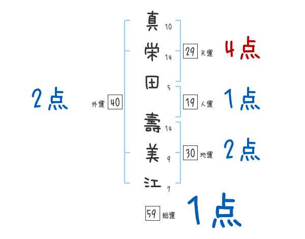 天運![]() | 真栄田壽美江さんの天運は29画の4つ星!完全主義で才能がある。厳格な心の持ち主。 家系が持つ宿命的な運勢を表します。祖先から受け継いだ苗字ですので自分の力が及びません。家柄を象徴します。 |