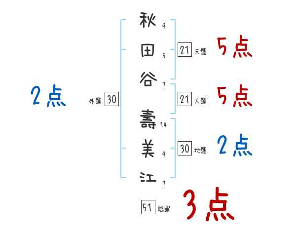 外運![]() | 秋田谷壽美江さんの外運は30画の2つ星!浮き沈みの激しさに注意しましょう。 生活面を象徴する運勢です。外部から受ける影響力を表し、結婚運、家庭運や職場、環境への順応性を表します。 |