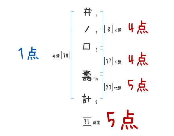 総運![]() | 井ノ口壽計さんの総運は31画の5つ星!社交性があり判断力に優れる。順風満帆な人生で円満な生活。 あなたの人生を表す1番重要な運勢です。生涯を通じて影響する総合運となり、主に50歳以降の晩年期に影響を及ぼします。 |