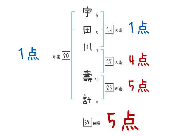 総運![]() | 宇田川壽計さんの総運は37画の5つ星!努力家で順応性に優れる。現実的な考え方ができ忠実に物事をこなす。 あなたの人生を表す1番重要な運勢です。生涯を通じて影響する総合運となり、主に50歳以降の晩年期に影響を及ぼします。 |