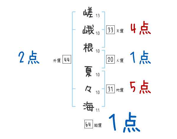 天運![]() | 嵯峨根夏々海さんの天運は33画の4つ星!権力志向でプライドが高い。勇気があり運を切り開き成功する。 家系が持つ宿命的な運勢を表します。祖先から受け継いだ苗字ですので自分の力が及びません。家柄を象徴します。 |