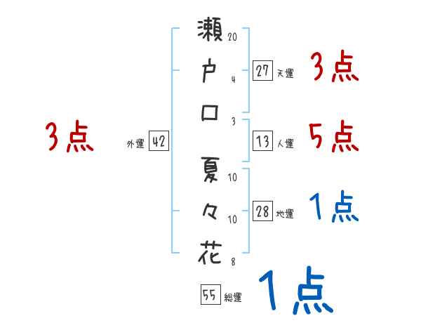 総運![]() | 瀬戸口夏々花さんの総運は55画の1つ星!欲張りな性格で軽率な行動に注意しましょう。病気に気をつけて。 あなたの人生を表す1番重要な運勢です。生涯を通じて影響する総合運となり、主に50歳以降の晩年期に影響を及ぼします。 |
