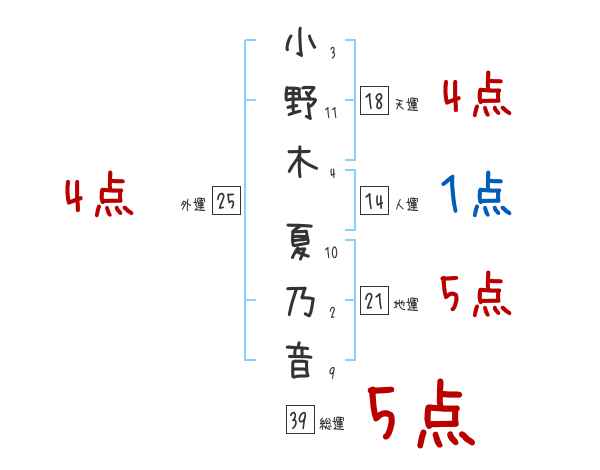 総運![]() | 小野木夏乃音さんの総運は39画の5つ星!社交性に優れ人望が厚い。人の上に立ち成功する。 あなたの人生を表す1番重要な運勢です。生涯を通じて影響する総合運となり、主に50歳以降の晩年期に影響を及ぼします。 |