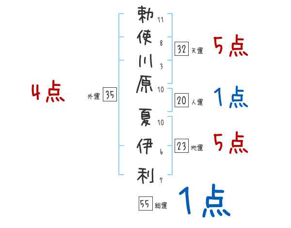 天運![]() | 勅使川原夏伊利さんの天運は32画の5つ星!柔軟性があり成功する。チャンスが多く金運が良い。 家系が持つ宿命的な運勢を表します。祖先から受け継いだ苗字ですので自分の力が及びません。家柄を象徴します。 |
