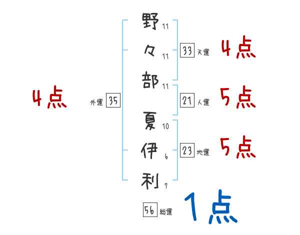 総運![]() | 野々部夏伊利さんの総運は56画の1つ星!消極的で無気力になりがち。誠実な気持ちが必要でしょう。 あなたの人生を表す1番重要な運勢です。生涯を通じて影響する総合運となり、主に50歳以降の晩年期に影響を及ぼします。 |