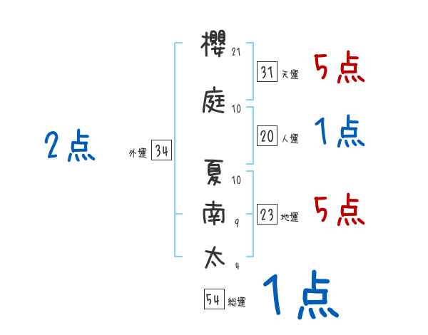 総運![]() | 櫻庭夏南太さんの総運は54画の1つ星!トラブルが多いかも。周りをよく見て協調して過ごしましょう。 あなたの人生を表す1番重要な運勢です。生涯を通じて影響する総合運となり、主に50歳以降の晩年期に影響を及ぼします。 |