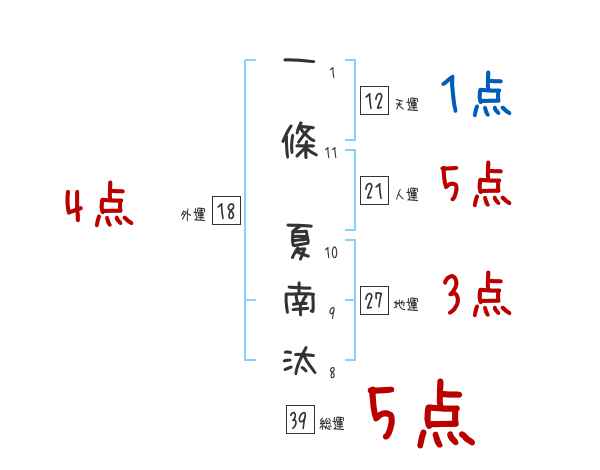総運![]() | 一條夏南汰さんの総運は39画の5つ星!社交性に優れ人望が厚い。人の上に立ち成功する。 あなたの人生を表す1番重要な運勢です。生涯を通じて影響する総合運となり、主に50歳以降の晩年期に影響を及ぼします。 |