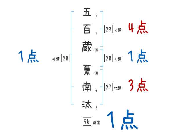 外運![]() | 五百蔵夏南汰さんの外運は28画の1つ星!家庭環境に注意。スポーツで活躍できる能力があるかも。 生活面を象徴する運勢です。外部から受ける影響力を表し、結婚運、家庭運や職場、環境への順応性を表します。 |