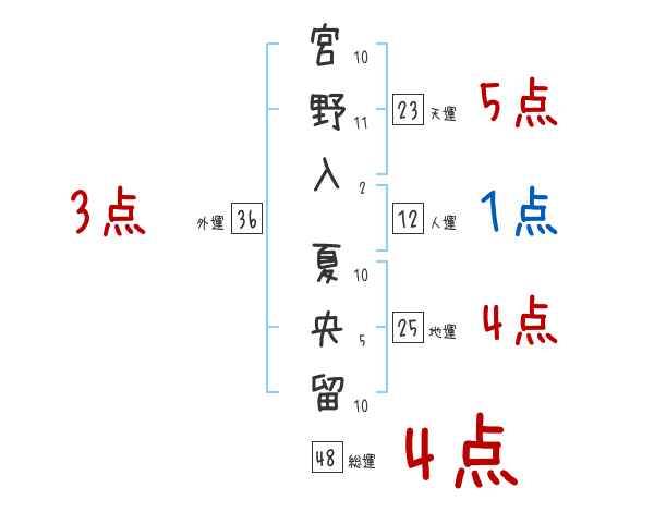 外運![]() | 宮野入夏央留さんの外運は36画の3つ星!先見性が豊かです。多少神経質で苦労することも。 生活面を象徴する運勢です。外部から受ける影響力を表し、結婚運、家庭運や職場、環境への順応性を表します。 |