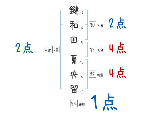 天運![]() | 鍵和田夏央留さんの天運は30画の2つ星!浮き沈みの激しさに注意しましょう。 家系が持つ宿命的な運勢を表します。祖先から受け継いだ苗字ですので自分の力が及びません。家柄を象徴します。 |