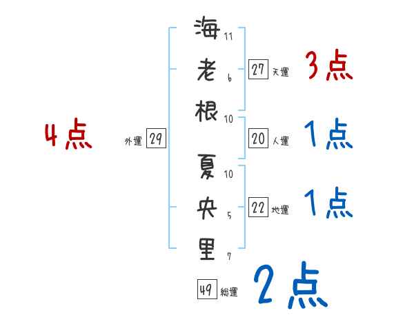 外運![]() | 海老根夏央里さんの外運は29画の4つ星!完全主義で才能がある。厳格な心の持ち主。 生活面を象徴する運勢です。外部から受ける影響力を表し、結婚運、家庭運や職場、環境への順応性を表します。 |
