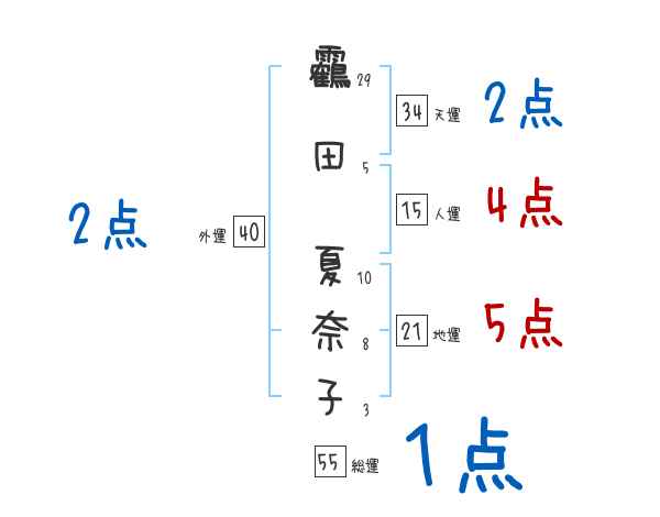 外運![]() | 靏田夏奈子さんの外運は40画の2つ星!自信過剰で物事に固執するためトラブルに注意。 生活面を象徴する運勢です。外部から受ける影響力を表し、結婚運、家庭運や職場、環境への順応性を表します。 |