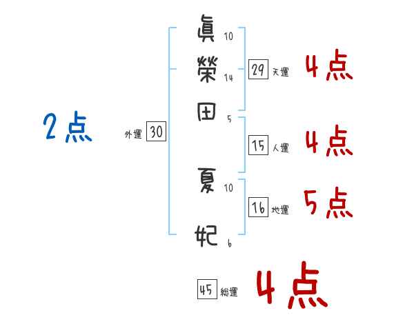 天運![]() | 眞榮田夏妃さんの天運は29画の4つ星!完全主義で才能がある。厳格な心の持ち主。 家系が持つ宿命的な運勢を表します。祖先から受け継いだ苗字ですので自分の力が及びません。家柄を象徴します。 |