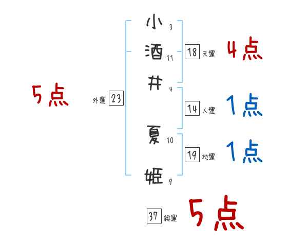 外運![]() | 小酒井夏姫さんの外運は23画の5つ星!想像力に優れ活力がある。一代で成功し名誉を手に入れる。 生活面を象徴する運勢です。外部から受ける影響力を表し、結婚運、家庭運や職場、環境への順応性を表します。 |