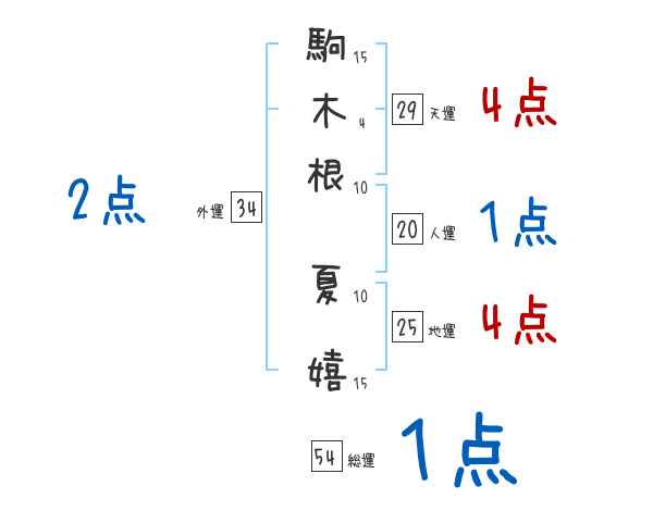 総運![]() | 駒木根夏嬉さんの総運は54画の1つ星!トラブルが多いかも。周りをよく見て協調して過ごしましょう。 あなたの人生を表す1番重要な運勢です。生涯を通じて影響する総合運となり、主に50歳以降の晩年期に影響を及ぼします。 |